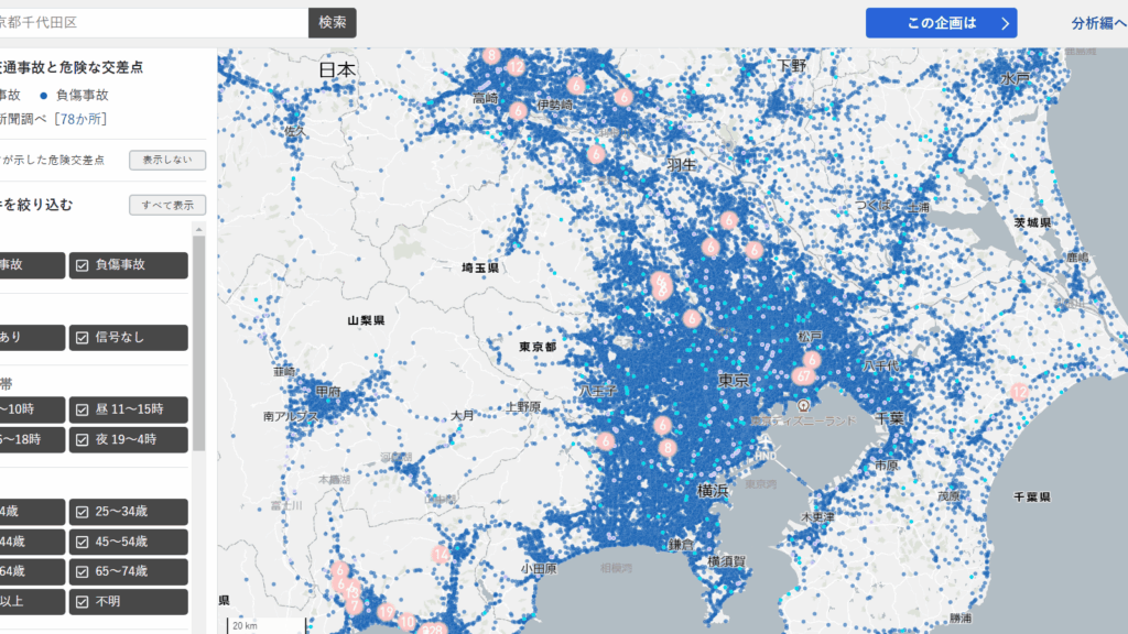 - 事故の分析データ:過去の事故傾向や発生時間帯を分析した情報が見れる。
