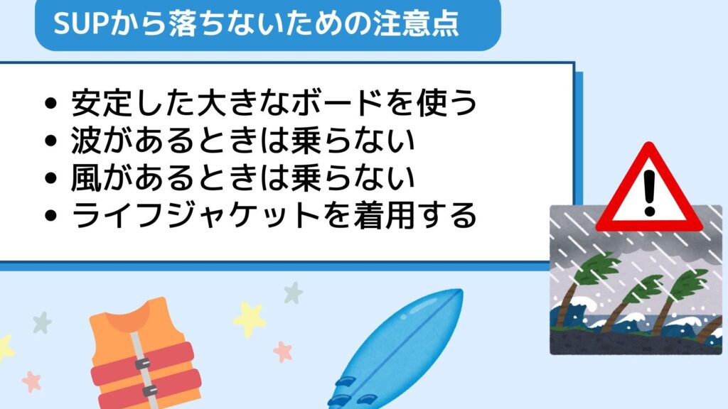 - 装備の不備: ボードやパドルの状態が悪いと、安全性が低下します。