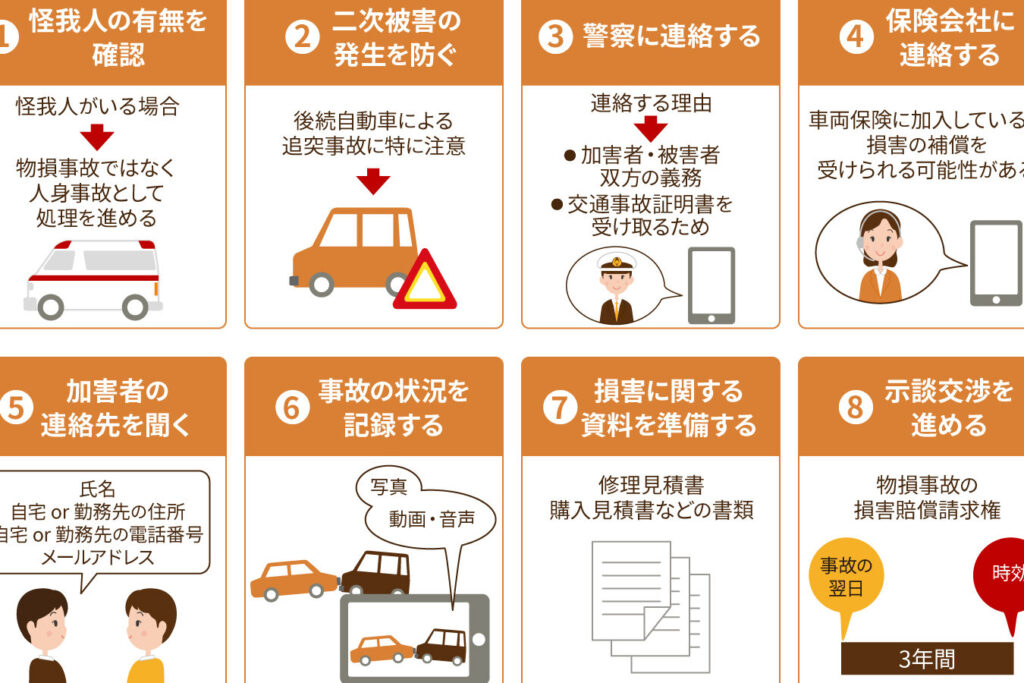 物損事故が発生した際には、迅速かつ適切な行動が必要です。まず、事故現場での行動を確認します。