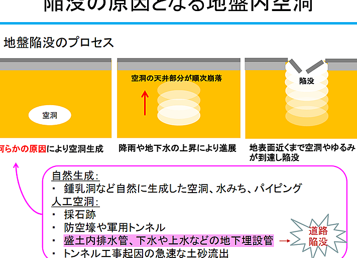 - 粘土質地盤: 吸水性が高く、雨天時に柔らかくなり、陥没を引き起こしやすい。