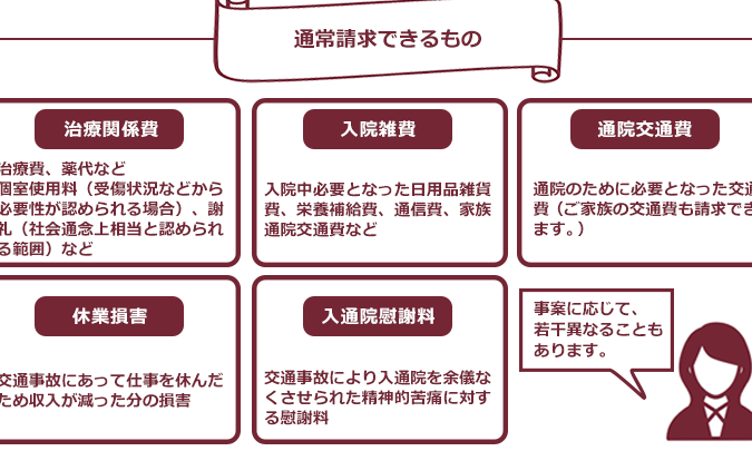 | 交通事故 | 医療費、通院、物損などが考慮される |