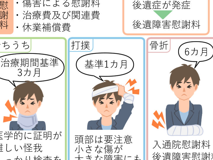 怪我の種類によって、通院の必要性や治療方針が変わります。たとえば、むち打ち症は数週間から数ヶ月の通院が必要になることがありますが、骨折の場合は治癒にもっと長い時間がかかることがあります。