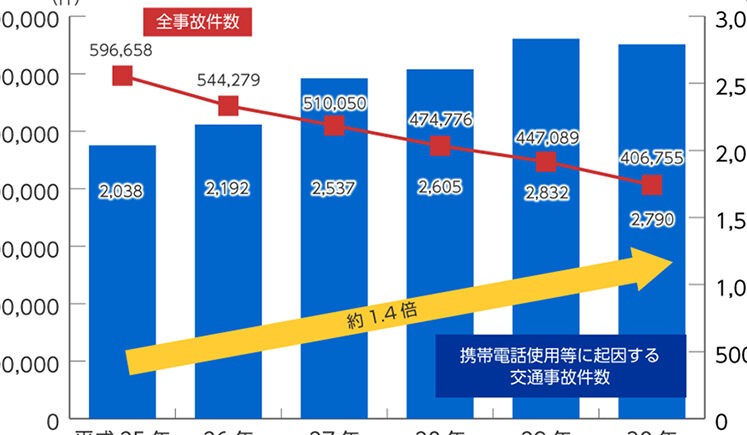 事故件数は年々増加しており、私たちの注意を喚起する必要がある。特に若年層での関与が目立ち、特にスマートフォンの使用偏重がこの傾向を助長している。