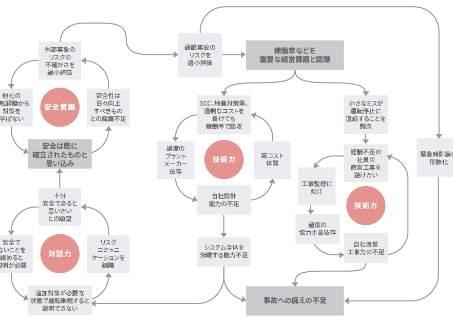 事故が引き起こされた背景には、東京電力の組織的な問題も存在します。例えば、危機管理体制の不備が目立ちました。緊急時対応計画の不完全さや、津波リスクの過小評価が問題でした。情報伝達の遅れも、社員間のコミュニケーション不足を示しており、意思決定の遅延を招いています。これにより、早期の避難措置が取れなかったことが不幸につながりました。