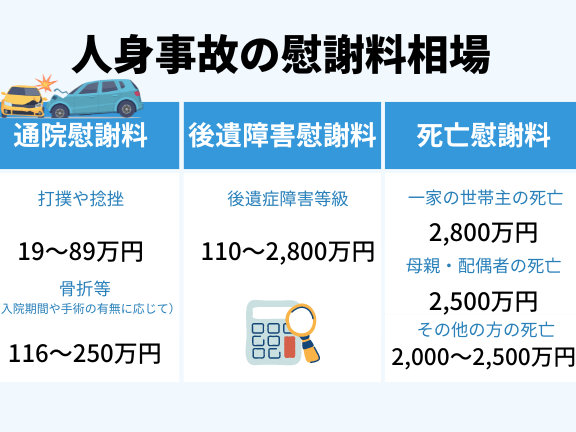 損害賠償も人身事故にかかる主要な費用の一つです。損害賠償には、以下のような項目が含まれます。