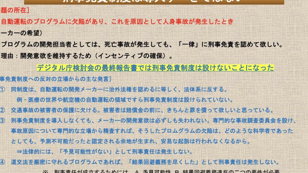 - ユーザー教育:自動運転技術の正しい使い方を説明し、リスクを周知させる責任があります。