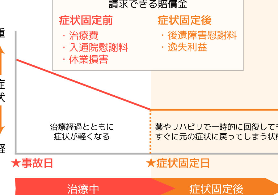 - 治療期:怪我の治療に数ヶ月から1年以上かかることがあります。事故の重症度によって異なります。