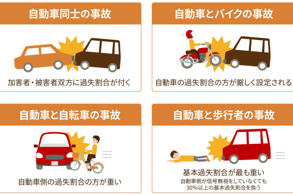 過失割合とは、事故において各当事者に帰属する責任の度合いを示す割合。交通事故の具体的なケースでは、以下の要素が考慮される。