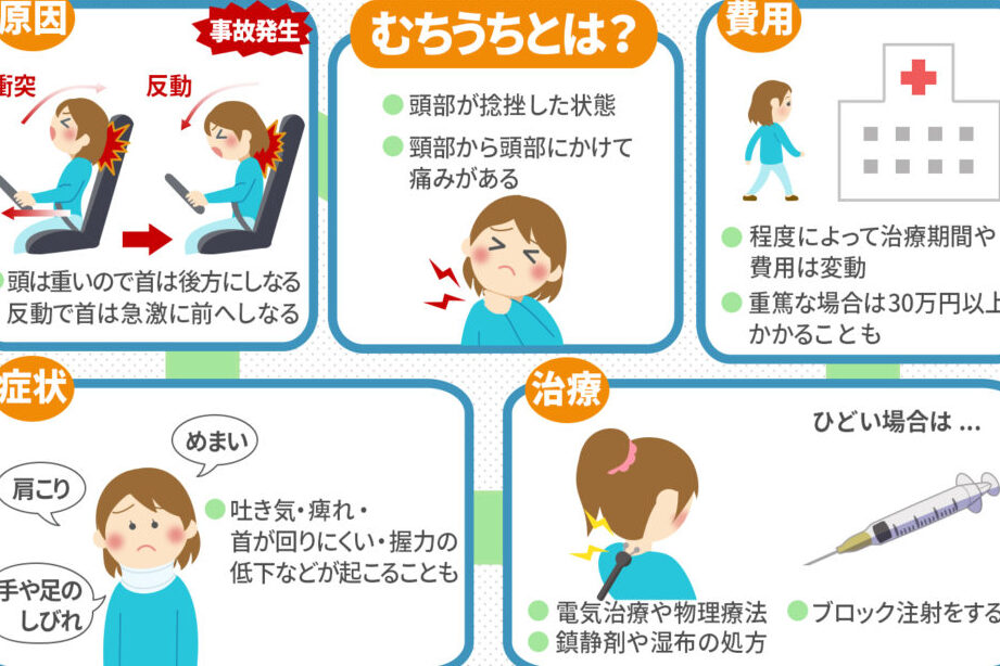 むち打ちは交通事故による首や背中の痛みを伴う症状です。事故発生後の状況によって症状は異なりますが、注意が必要です。