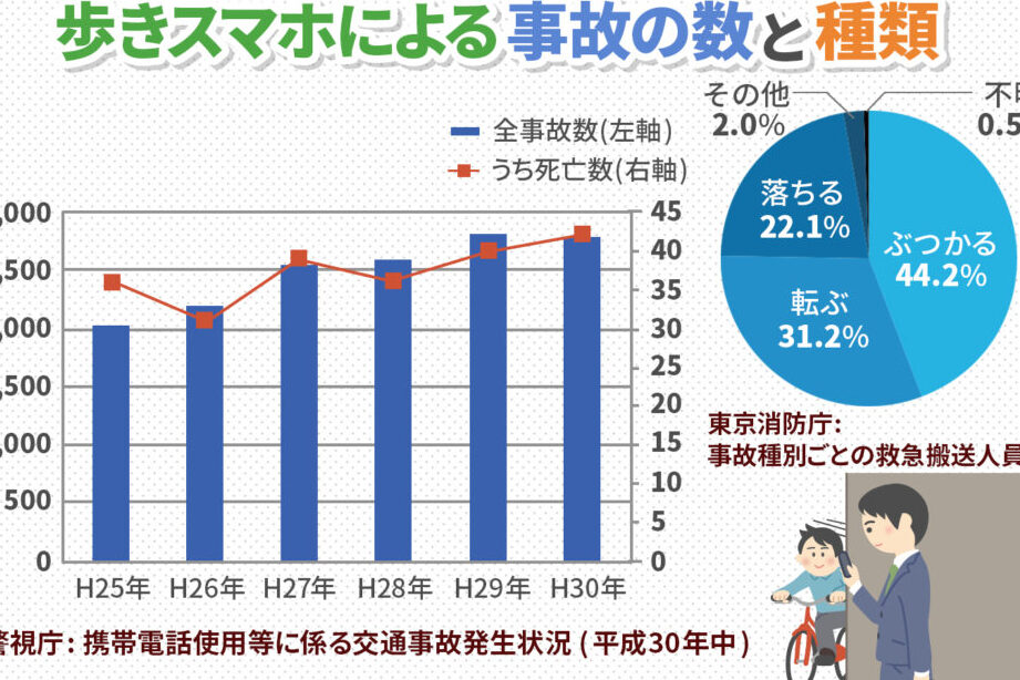 歩きスマホ事故は社会問題として大きな注目を集めています。事故件数の増加が懸念されています。