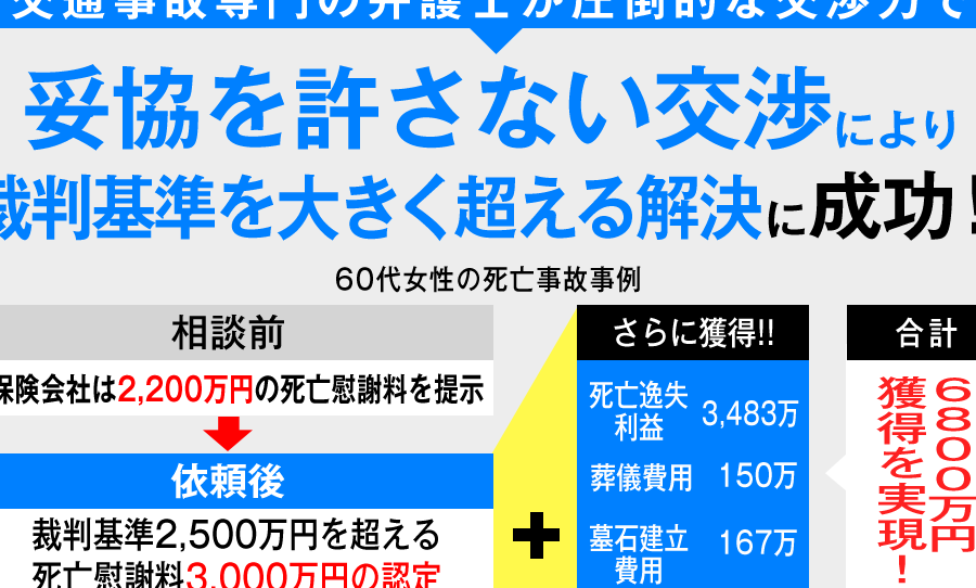 - 若年層の被害者: 将来の収入損失が大きいため、場合によっては賠償金が6000万円を超えることがあります。