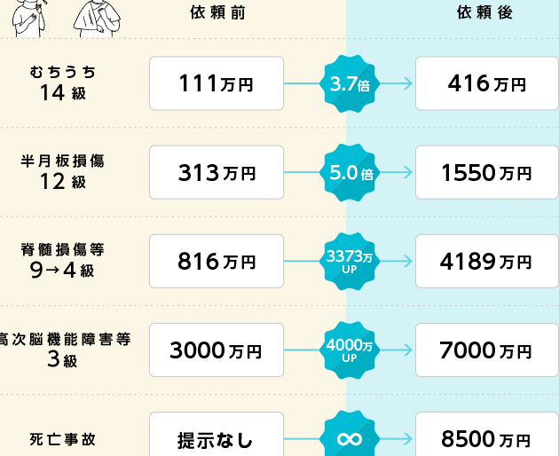 - 多発骨折: 車両による衝突により、腕と脚の同時骨折。入院日数が60日を超え、最終的に慰謝料は650万円に達した。